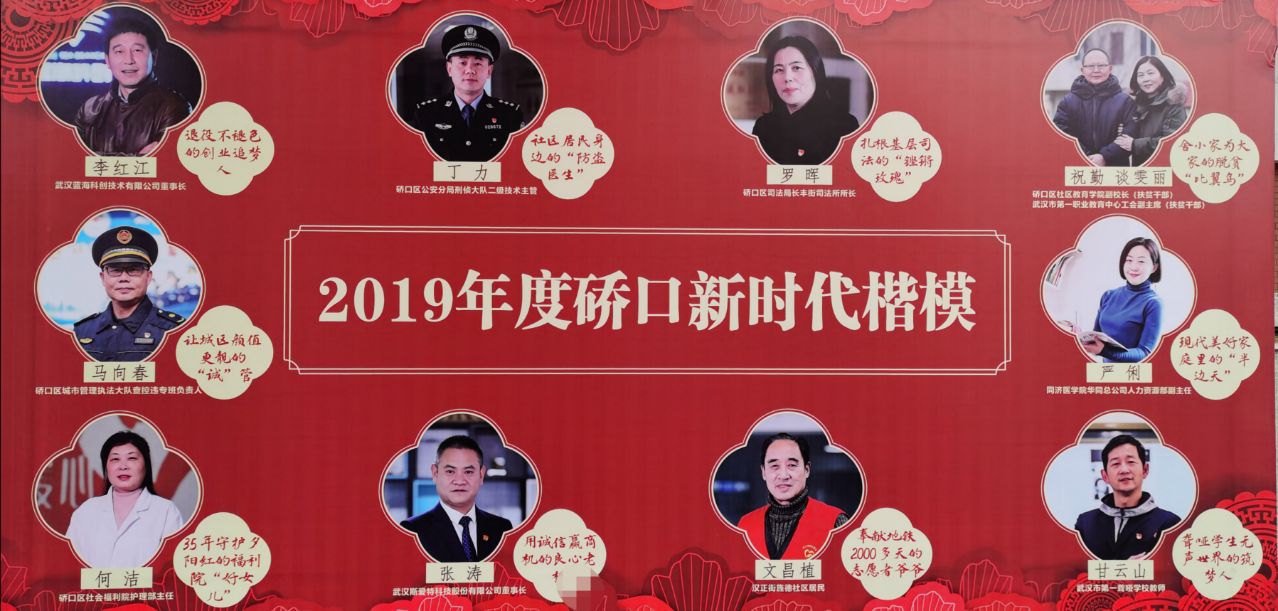 2019年12月根據(jù)硚口區(qū)委精神文明建設指導委員會《關(guān)于在全區(qū)開展2019年度“硚口新時代楷?!蓖圃u活動的通知》(硚文明委〔2019〕6號)要求按照“動員發(fā)動、民主推薦、評選審定”的程序,經(jīng)區(qū)委文明委研究,確定2019年度“硚口新時代楷?!焙蜻x人10名,我司董事長張濤同志成功當選“硚口新時代楷?!狈Q號。
