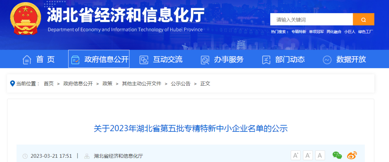 根據(jù)省經(jīng)信廳辦公室《關(guān)于開展第五批專精特新中小企業(yè)培育工作的通知》文件要求,2023年湖北省第五批專精特新中小企業(yè)名單已公示,全省此次入選企業(yè)共1803家,我司順利入選。